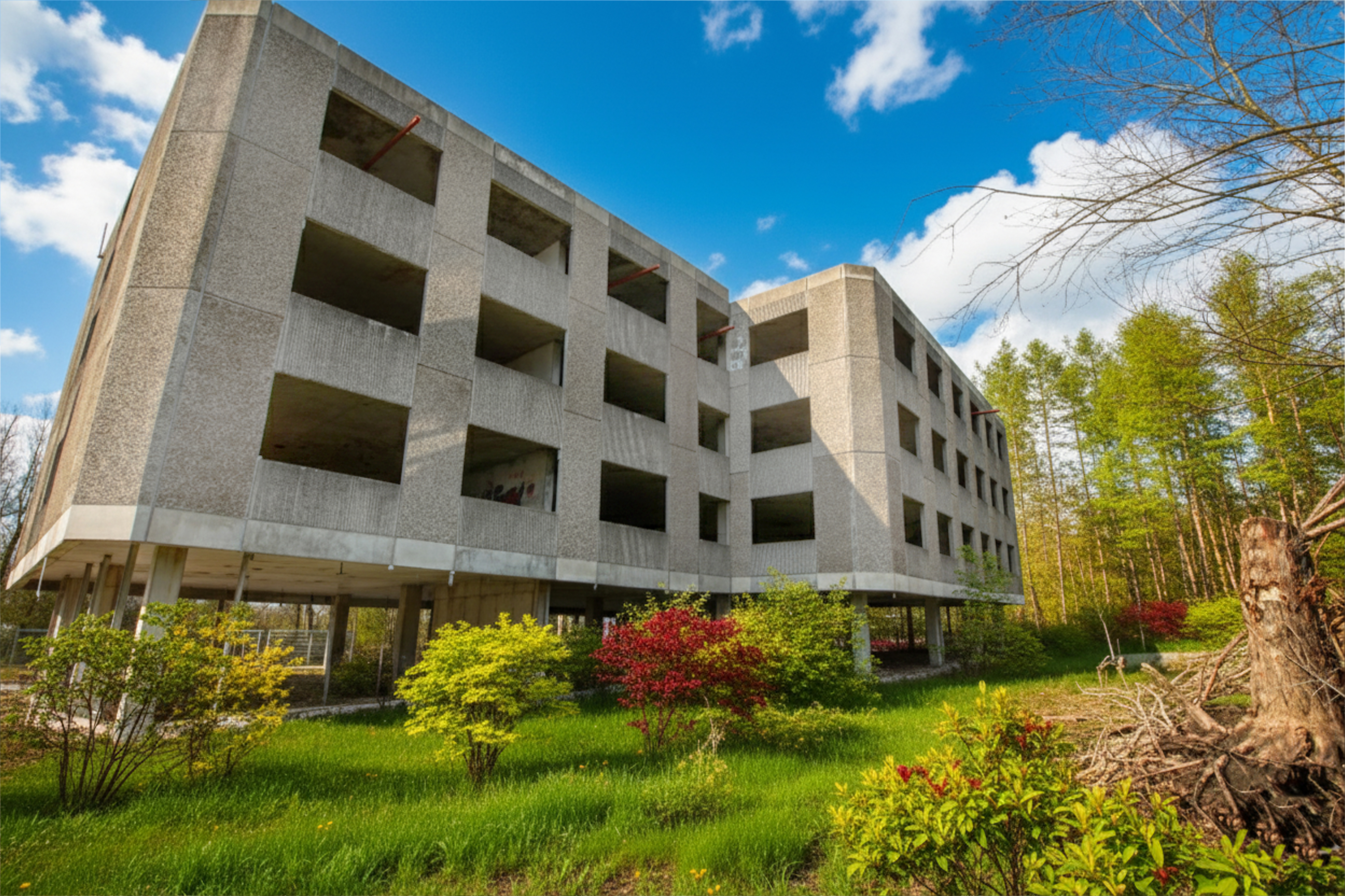 Bereits vorhanden ist ein Rohbau aus dem Jahr 1989 mit ca. 2.836 m² Bruttogeschossfläche auf vier Ebenen.